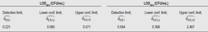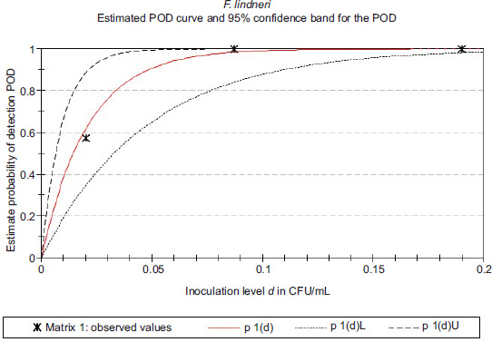 The POD function and LOD were calculated according to the model presented by Wilrich and Wilrich (2009). POD function p(d) is the functional relationship between the probability p of obtaining a measurement result = 1 and the contamination of the test material, quantitatively expressed as the CFU of the microorganism of the defined type per unit of weight or volume, d (CFU/g or CFU/mL).