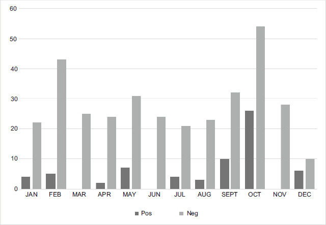 The results were reported as growth (POS) or not detected (N.D.). Furthermore, Figure 4 illustrates the application frequency of the validated method in 2024. As the graph shows, the method was applied for 404 times, achieving a positive result rate of 16.6%. Figure 4 provides a practical overview of the method’s real-world utility and the prevalence of microbiological issues in the brewing process over 2024. The total of 404 applications signifies its frequent use as a routine QC tool. The observed 16.6% positive result rate indicates that the beer-spoilage microorganisms were detected in approximately one-sixth of the analyzed samples. This highlights the continuous challenge of microbial contamination in brewing, and underscores the necessity of a reliable and sensitive detection method such as the one validated here to monitor and ensure product quality. The monthly distribution of positive and negative results could potentially offer insights into seasonal variations or specific operational periods with higher contamination risks, further reinforcing the value of continuous monitoring.
