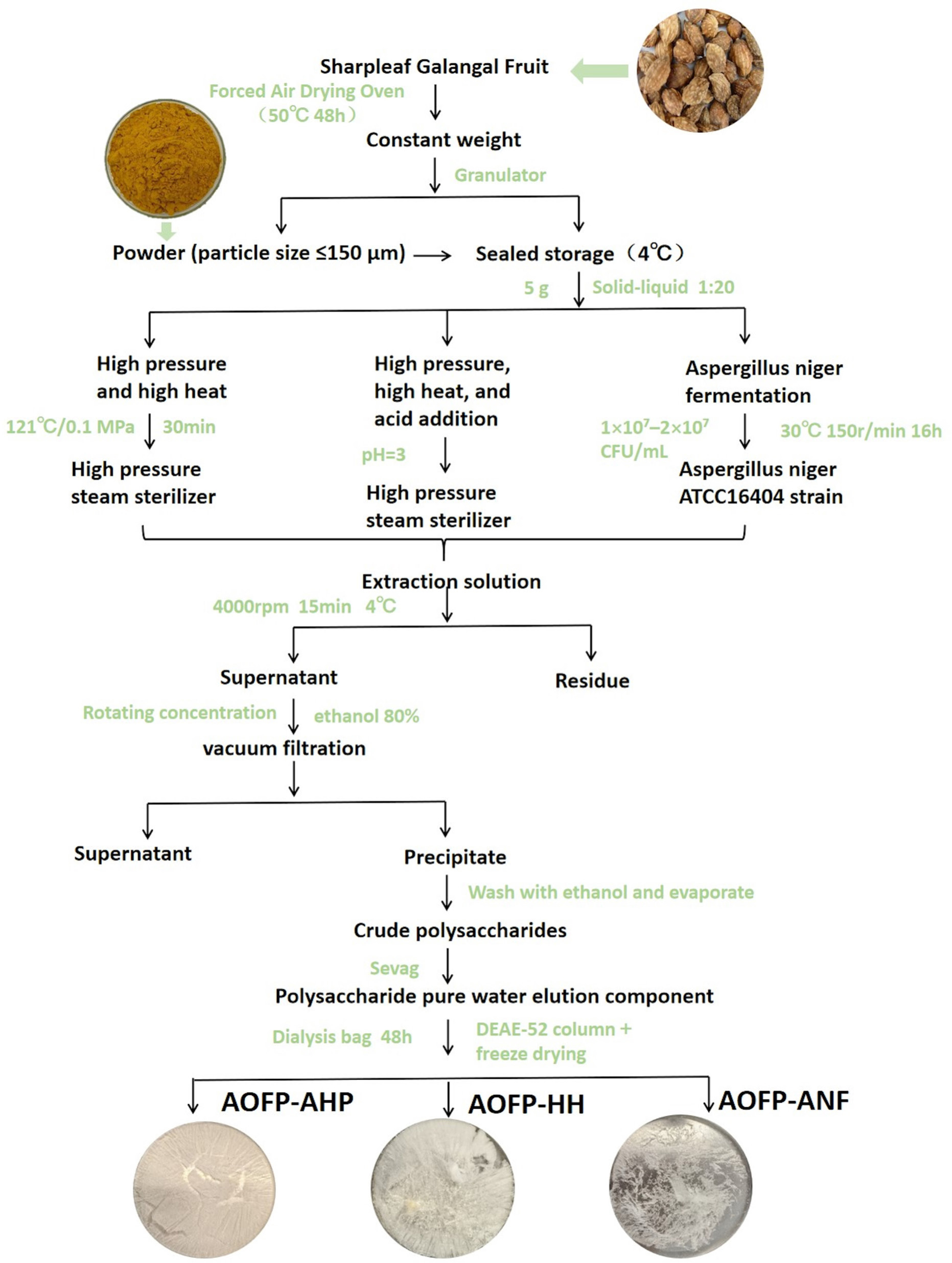 In addition to hypoglycemic potential, AOFP demonstrates significant antioxidant activity according to Ruan et al. (2021), immunomodulatory effects, such as promoting splenic lymphocyte proliferation by 28%, and anti-inflammatory properties as reported by Zhang et al. (2015). However, current studies only characterize polysaccharides from a single extraction method and correlate them with individual activity indicators. There is a lack of systematic comparison and integrated evidence that connect the multidimensional structural features of AOFPs from different extraction processes with their comprehensive bioactivities. Therefore, this study aims to systematically compare three AOFP extraction techniques: high-pressure and high-temperature (HH), acid-assisted high-pressure and high-temperature (AHP), and Aspergillus niger fermentation (ANF). The comparison focuses on key physicochemical properties, including extraction yield, purity, molecular weight distribution, monosaccharide composition, and surface morphology.