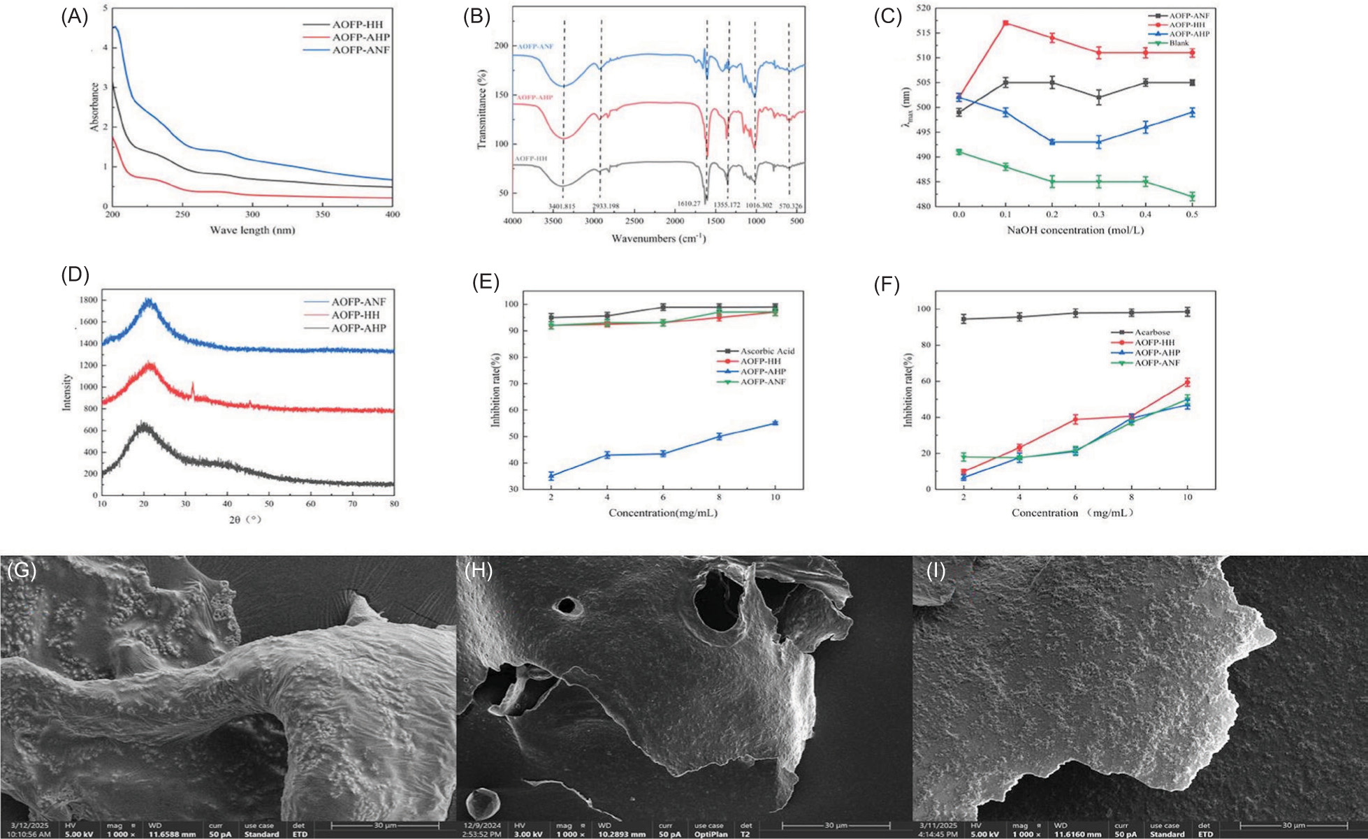 Figure 2. The structural and functional characterization of three AOFPs: (A) UV-Vis absorption spectra; (B) Fourier transform infrared (FTIR) spectra; (C) Congo red assay results; (D) X-ray diffraction (XRD) patterns; (E) α-Amylase inhibition rates; (F) -α-Glucosidase inhibition rates; (G-I) Scanning electron micrographs (SEM) at 1000× magnification: (G) AOFP-HH, (H) AOFP-AHP, (I) AOFP-ANF.