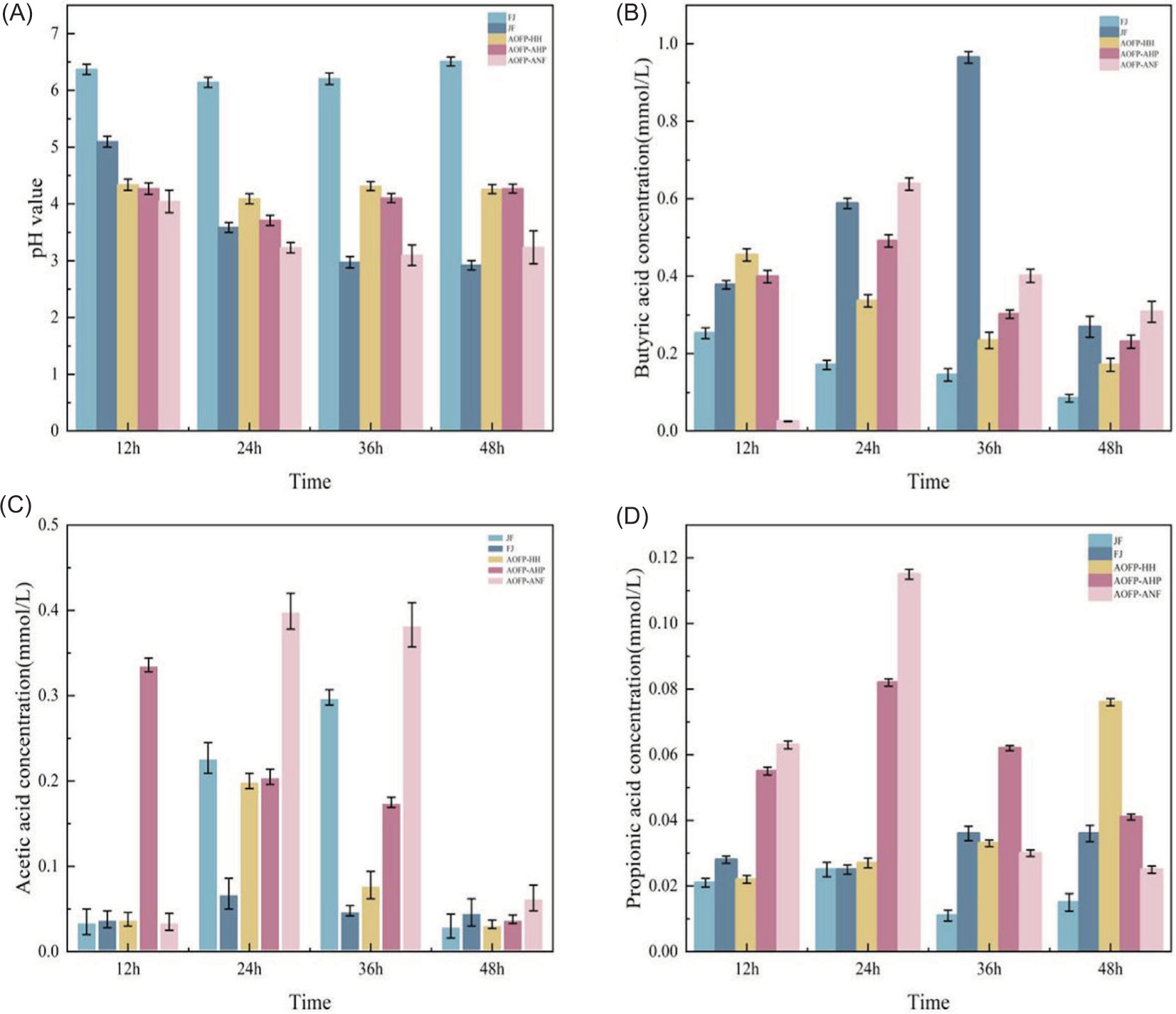 The pH evolution profiles during fermentation (Figure 4A) further elucidated the metabolic characteristics of different AOFPs. All AOFP-treated groups exhibited significantly lower pH values compared to the blank control (FJ group, pH 6.1), indicating substantial production of acidic metabolites through microbial polysaccharide fermentation. Specifically, the AOFP-ANF group showed a continuous pH decline (12 h: 4.0 → 48 h: 3.2), consistent with its OD value changes, whereas AOFP-HH and AOFP-AHP displayed fluctuating decreases with transient midphase recoveries. These differences likely reflect structural heterogeneity among AOFPs, containing both readily fermentable oligosaccharide components and high-molecular-weight fractions requiring prolonged degradation.
