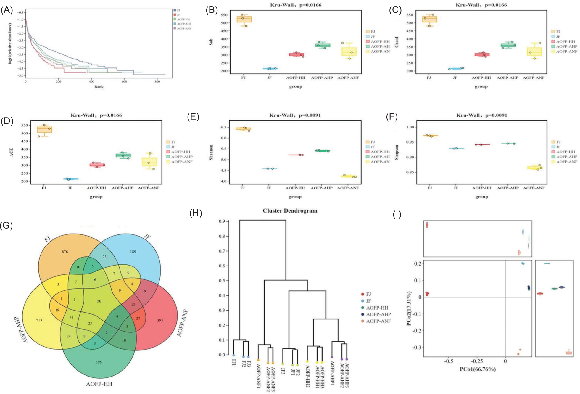 Alpha diversity analysis (Figures 6A–6F) revealed -significant differences in gut microbiota diversity among the five experimental groups (Kruskal–Wallis test, P = 0.0166). The FJ group exhibited the highest microbial diversity, with Shannon index (6.4 ± 0.2), Chao1 (536 ± 13), and ACE index (530 ± 12) all significantly surpassing other groups (P < 0.05). Its rank abundance curve showed a steep decline in low-rank regions, indicating a complex community structure with even species distribution. Conversely, the JF group displayed the lowest diversity levels, characterized by minimal Shannon (4.6 ± 0.3) and Simpson (0.93 ± 0.04) indices, while Chao1 and ACE indices were only 40% of FJ values (P < 0.01); its rank-abundance curve suggested dispersed dominant taxa. Notably, AOFP intervention groups demonstrated treatment-dependent patterns: The AOFP-HH group showed an intermediate Shannon index (5.3 ± 0.3) between FJ and JF, with a 58% higher Chao1 than JF (P < 0.05), but a plateau in low-rank regions of its rank-abundance curve implied convergence toward specific dominant species. The AOFP-AHP group paradoxically presented the highest Shannon index (5.5 ± 0.2) alongside the lowest Chao1 (360 ± 8), reflecting reduced richness concurrent with dominance concentration. The AOFP-ANF group exhibited the lowest Simpson index (0.86 ± 0.05) and Shannon index (4.2 ± 0.3) comparable to JF. Collectively, these findings indicate that AOFP interventions selectively enriched functionally core taxa, enhancing community functional stability despite reducing overall diversity, providing theoretical support for a “quality over quantity” strategy in microbiota modulation.