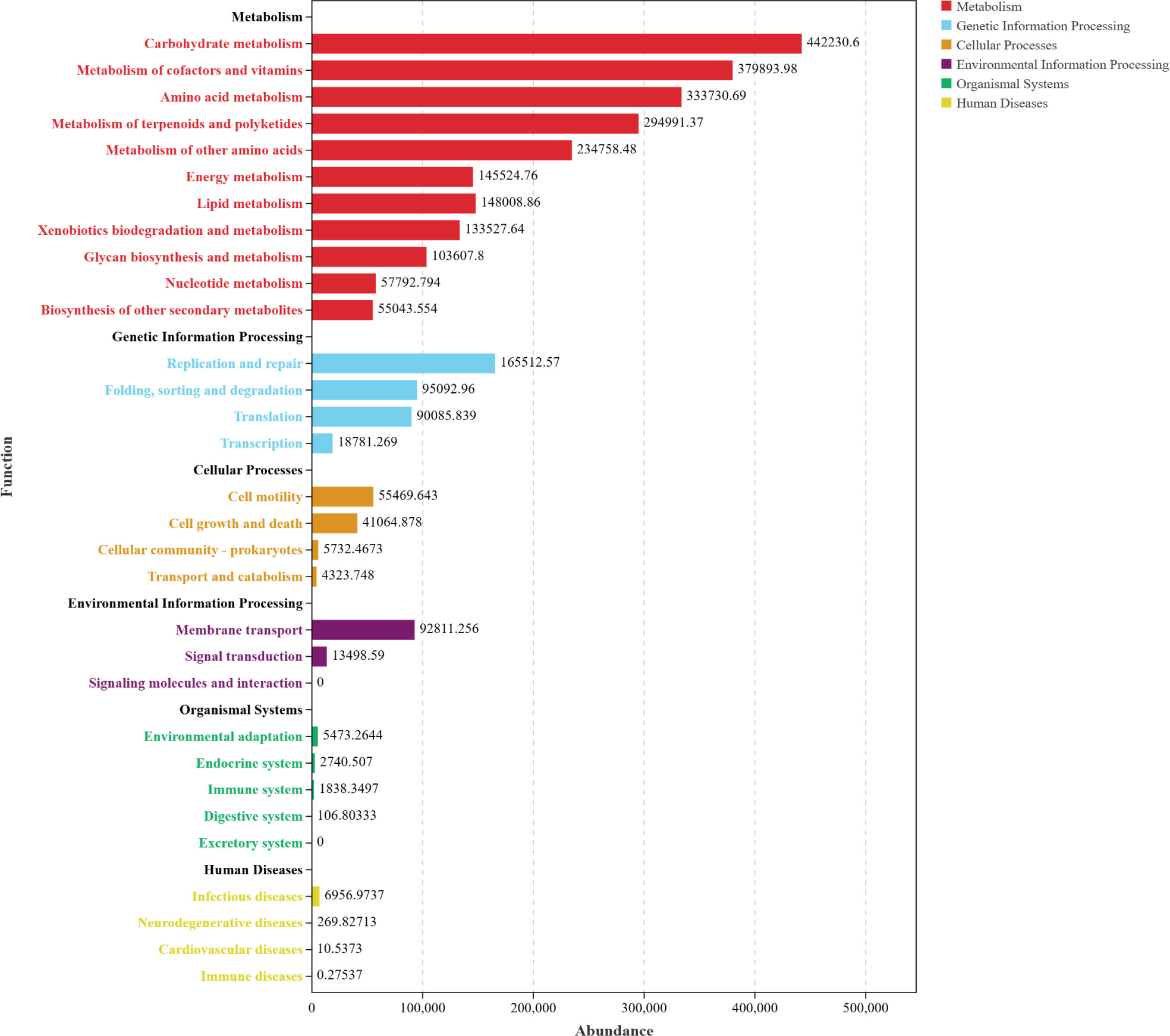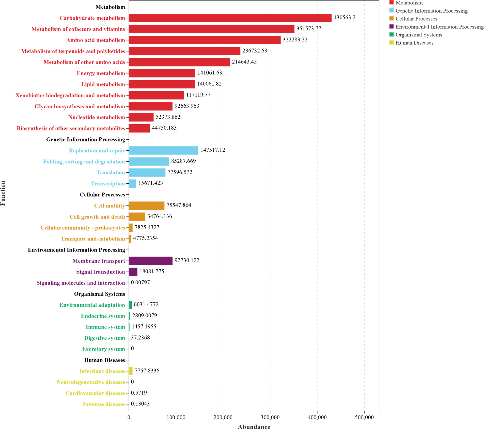 Based on Functional distribution overview (Figure 7), the three AOFP interventions significantly activated microbial functional profiles. The total abundance of metabolic pathways exceeded 400,000, accounting for 37.5–44.2% of the functional gene repertoire (significantly higher than the control group, P < 0.05). Carbohydrate metabolism was most enriched in the AOFP-HH (Figure 7A), suggesting that high--pressure and high-temperature extracted polysaccharides enhance carbohydrate decomposition via their well-ordered β-1,3-glucan structures. The AOFP-AHP group (Figure 7B) showed superior performance in cofactor and vitamin metabolism (P < 0.01), likely attributable to its low-molecular-weight fragments (1.03 kDa) promoting coenzyme synthesis (Cheng et al., 2024).