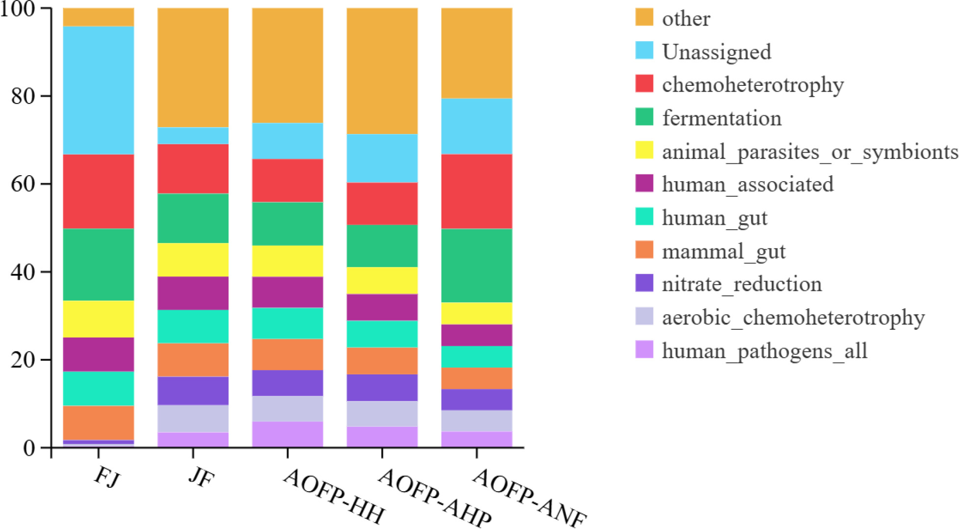 The Venn diagram analysis (Figure 5A) of the five groups (FJ, JF, AOFP-HH, AOFP-AHP, AOFP-ANF) identified 2,169 OTUs, with only 50 core OTUs shared across all groups. Group-specific distributions showed FJ possessed the highest number of unique OTUs (676), followed by AOFP-AHP (513), AOFP-ANF (395), AOFP-HH (396), and JF (189). Among AOFP treatments, AOFP-HH exhibited the greatest microbial diversity (most unique species), while AOFP-AHP and AOFP-ANF showed reduced diversity, potentially due to polysaccharide extraction methods simplifying community structure. Notably, just three OTUs were common to all AOFP groups, indicating substantial functional or metabolic divergence, while greater OTU overlap between AOFP-HH and AOFP-ANF suggests shared regulatory mechanisms.